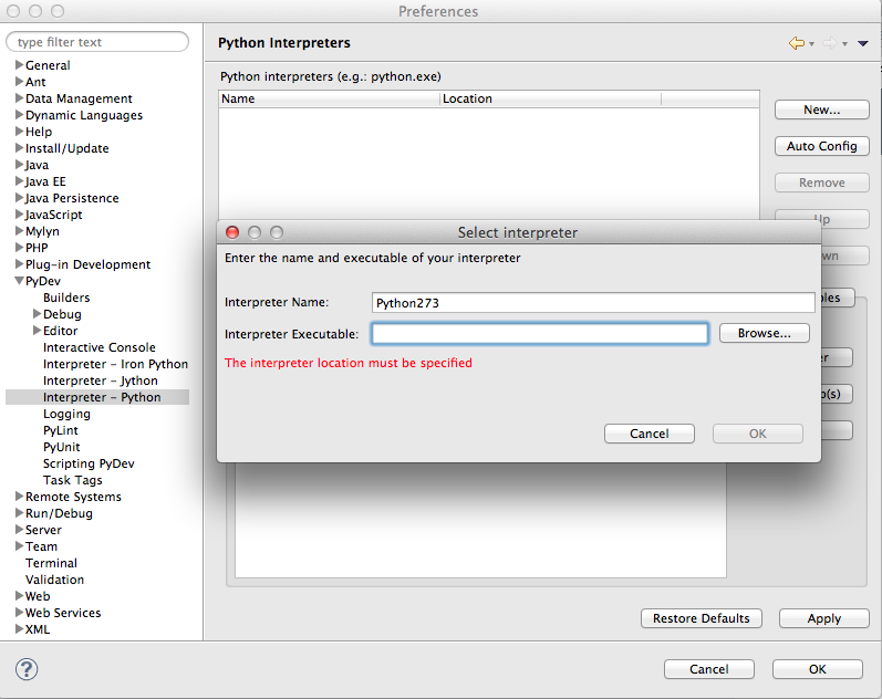 Once eclipse comes back, open the preferences pane and expand pydev and select the Interpreter - Python option. Click on the New button on that screen and fill out the interpreter name and select the path to python in your virtualenv (/Users/username/.virtualenvs/python273/bin/python)