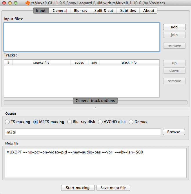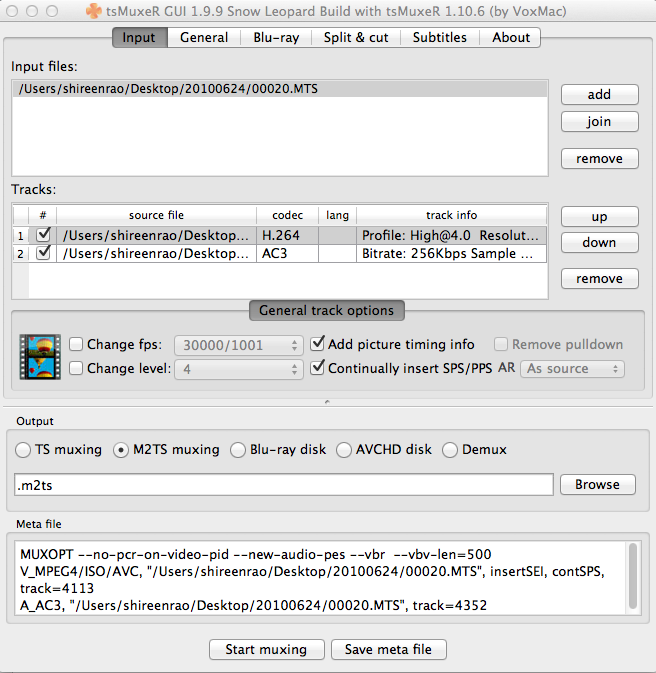 This is where the freeware tsMuxer comes to the rescue. SmartLabs doesn’t offer this app anymore, but you can download this from videohelp.com. You can download the app for windows, linux and Mac. If you are running OSX, use the VoxMac Unofficial Build. Even this build does not work correctly because of some korean fonts (I would love to know why). Here is a snippet from macrumors forums on how to fix that problem.
