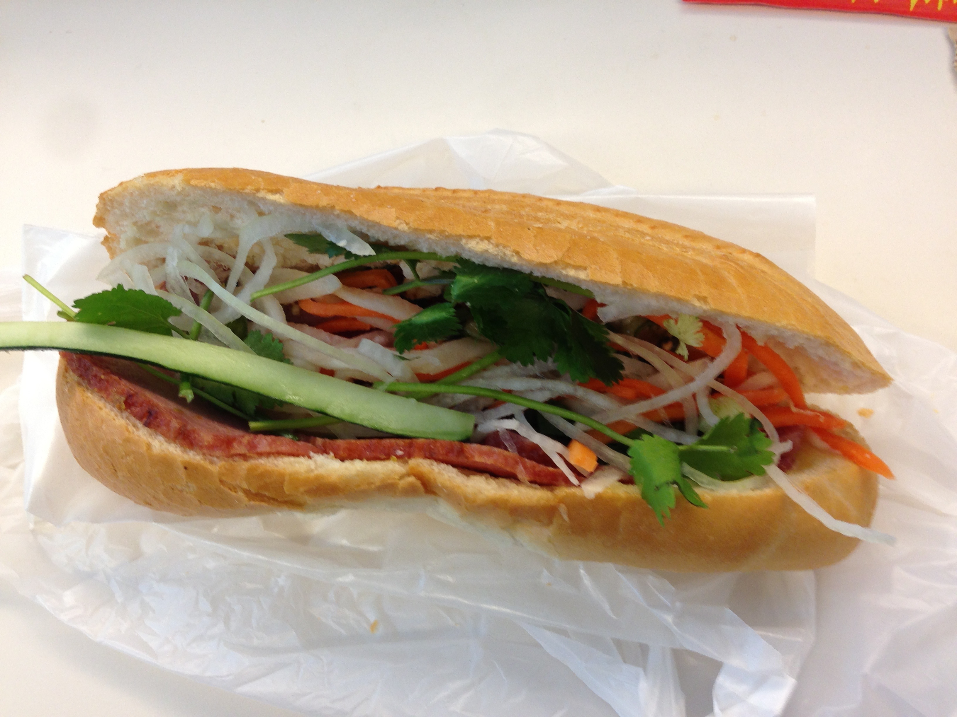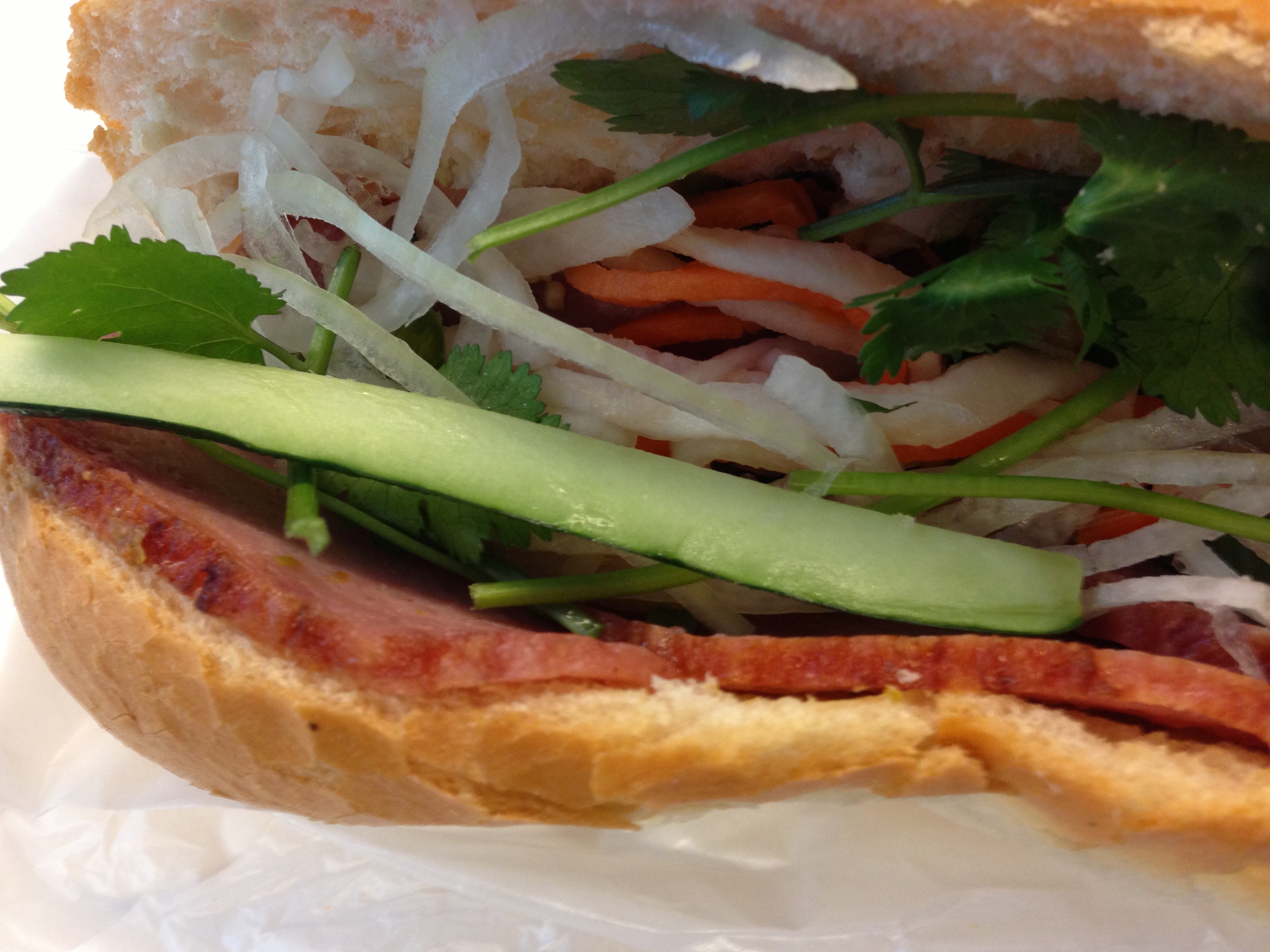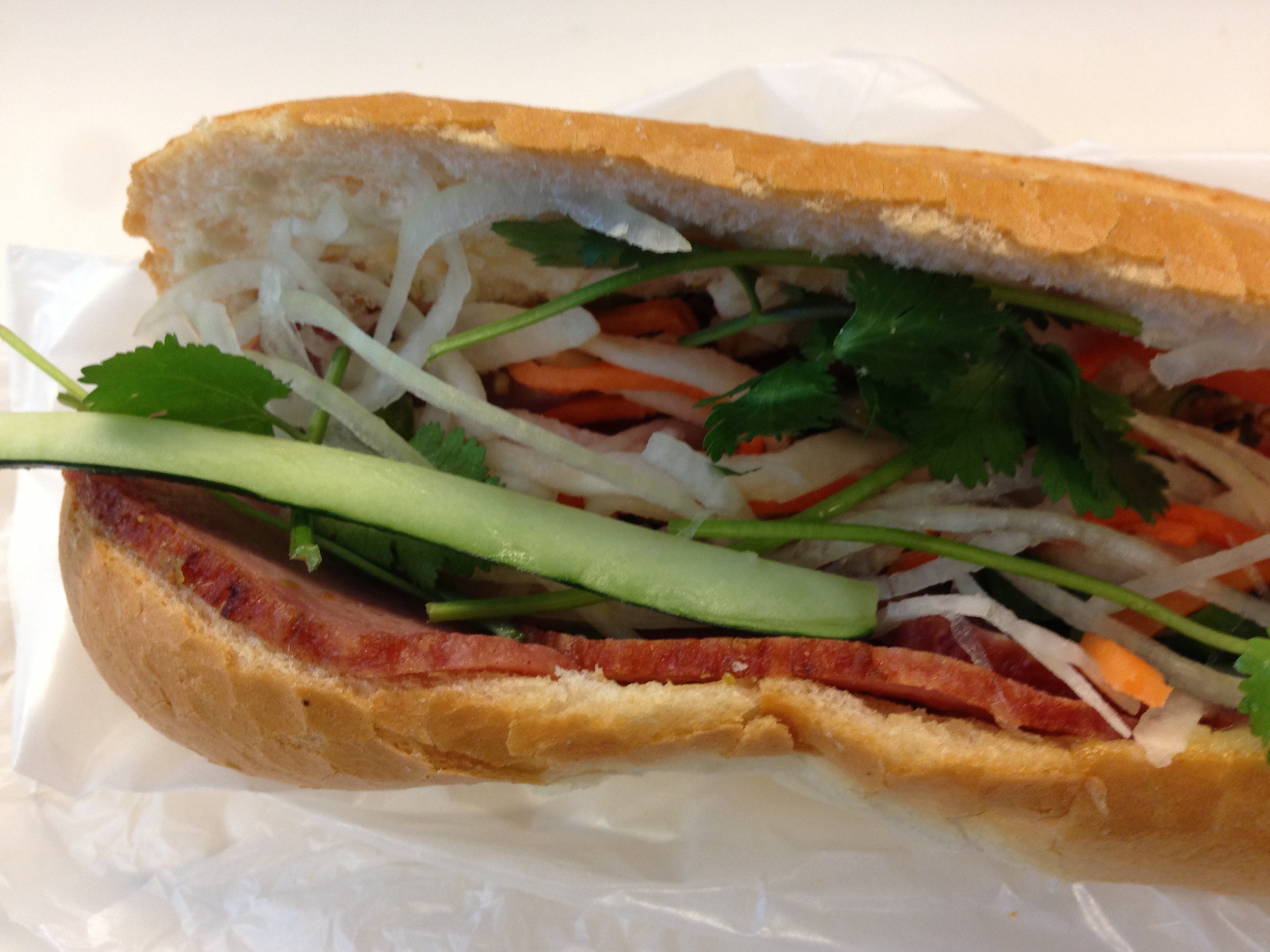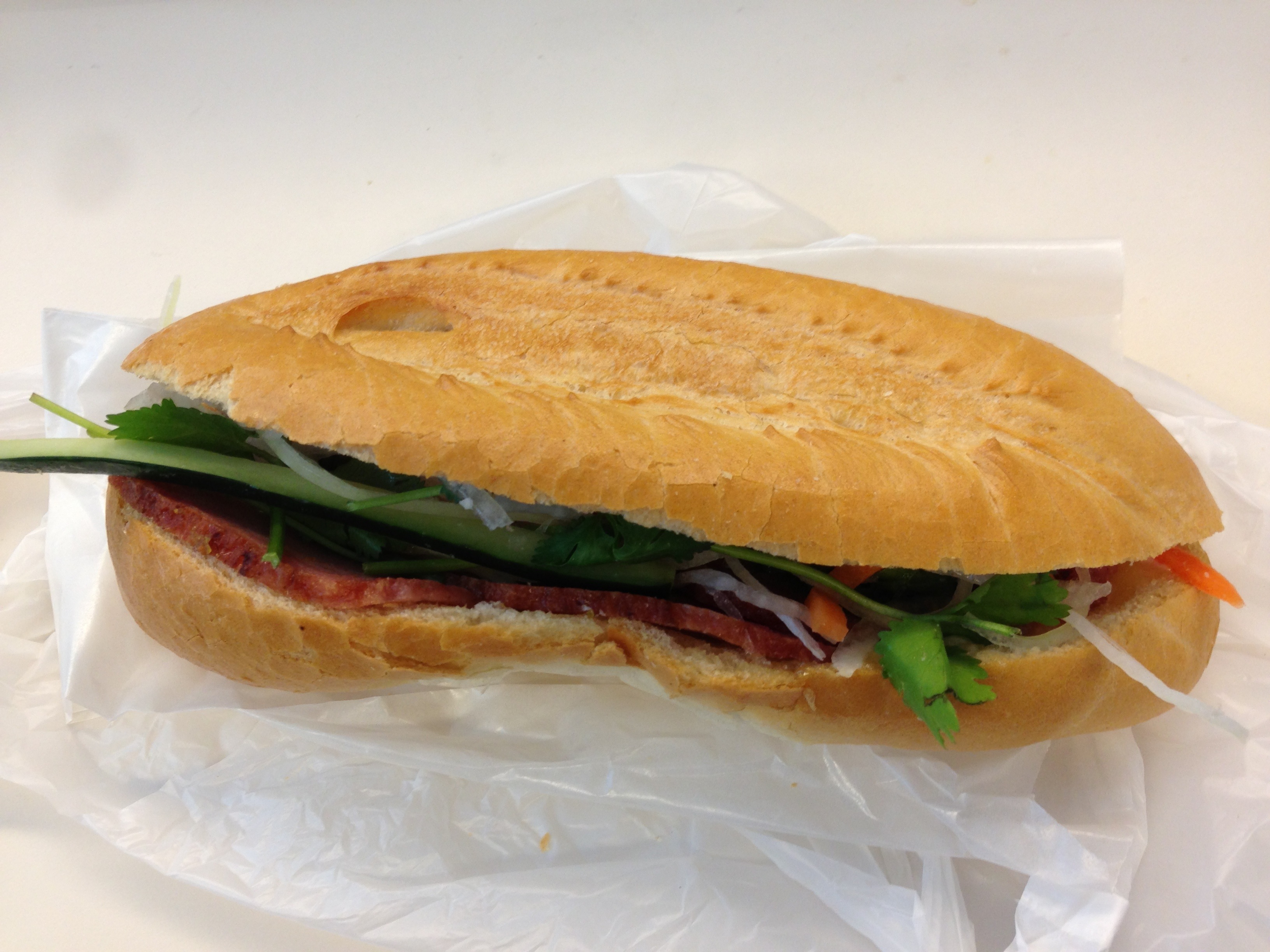 The roast pork looked like thickly cut ham with the usual fixings of vietnamese mayo, drizzle of some kind of fish sauce, thinly sliced cucumbers carrots and daikon, chopped scallions and cilantro on a crispy baguette. I usually ask for my sandwich to be spicy so they add some chopped up Thai Chillies. For $3.75 it’s a steal.