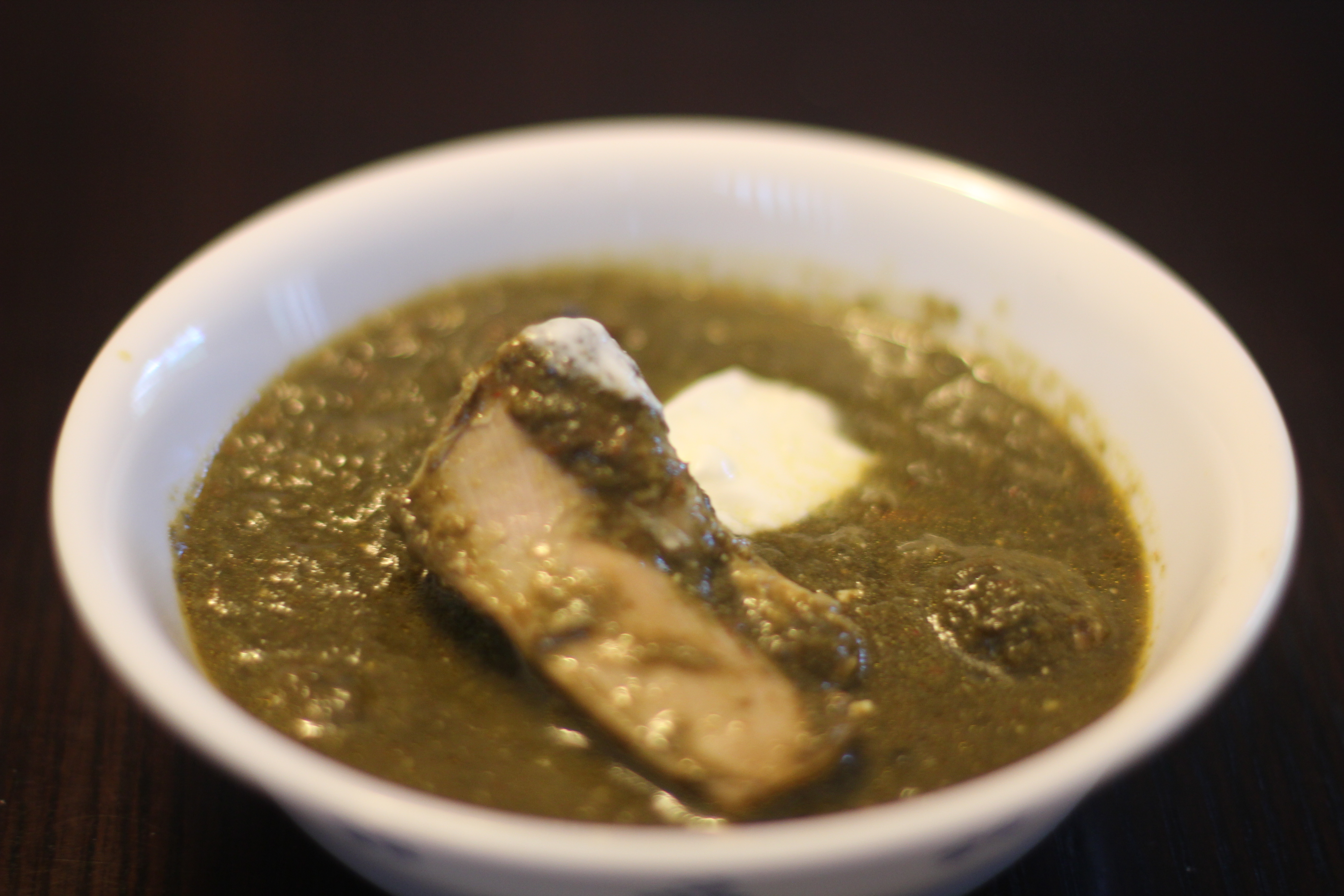 Stir in the spinach puree you made earlier. Add about 3/4 cup of water and simmer for 5 minutes. Add your beaten yogurt and mix it well into the spinach mixture and simmer for another 5 minutes. Now add your chicken and stir the spinach to coat the chicken. Cover and cook for 25-30 minutes on medium to low heat till the chicken is tender.